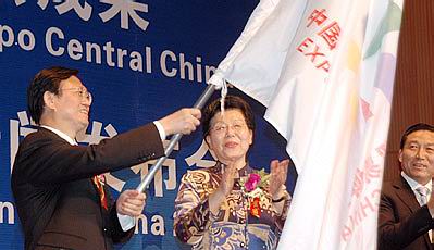 河南省副省长史济春将中博会会旗交予商务部副部长马秀红,马秀红当即将会旗转交湖北省副省长李春明。