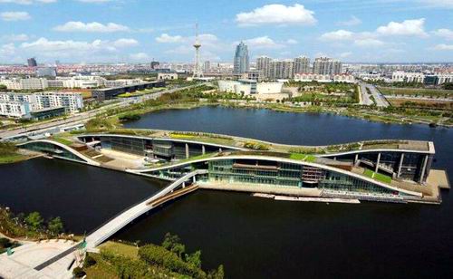 材料三:青浦区图书馆是国内首家“水上图书馆”,近看远望,这座建在夏阳湖浦阳阁的别致建筑,究如两条巨型波浪从东西两边伸向湖心。新落成的青浦万达茂,建筑整体外观呈现莲花绽放的美感,辅以流动的线条如同层层水波,舒缓有致,充分诠释青浦水文化的魅力。