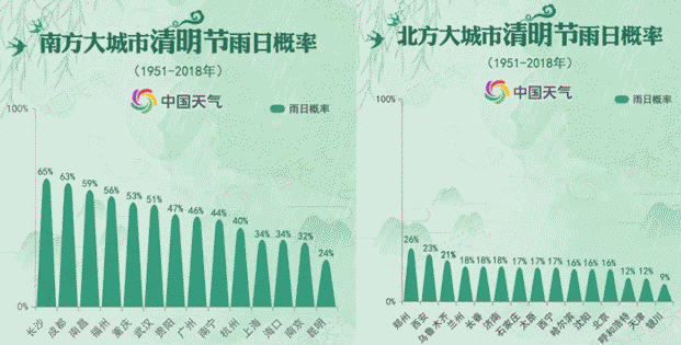 ②清明时节雨日的概率明显比南方小,好多地方不到20%