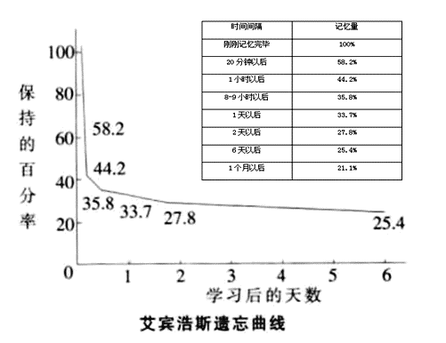 这是“艾宾浩斯遗忘曲线图”。请根据给图表总结出遗忘的规律,再
