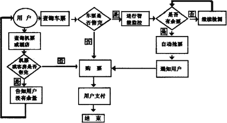 (1)用户先查询车票,若未售完可以购票,用户支付后购票结束。若车票售完则进行智能监控,此时,若没有余票,则继续检测;若有余票则自动抢票,成功后通知用户购票。