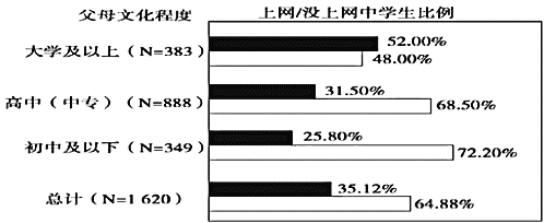 用简洁的文字说明下表的结论 父母文化程度 上网没上网中学生比例