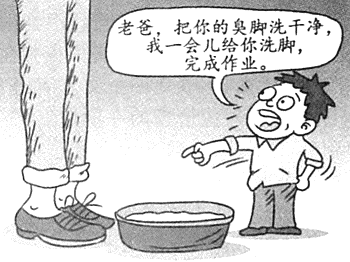 概述漫画内容并揭示其寓意。老爸,把你的臭脚洗干净,我一会儿给
