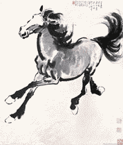 在《奔马图》(见上图)中,徐悲鸿运用饱酣奔放的墨色,勾勒头、颈、胸、腿等大转折部位,并以干笔扫出鬃尾,①【 】。马腿的直线细劲有,②【 】而腹部臀部及鬃尾的弧线很有弹性,富于动感。整体上看,画面前大后小,透视感较强,全伸的双腿和马头有很强的冲击力。徐悲鸿早期画的马③【 】,建国后画的马虽然是奔腾驰骋的样子,却多了欢快振奋。画中的马雄骏、矫健、轻疾,④【 】这幅《奔马图》赋予了画家自己的个性和理想——为振兴民族艺术而奋斗!