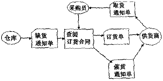 下面是某公司物资订货的业务流程图。试把这个图表转写成一段文字