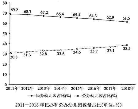 阅读图表,然后用一个转折关系的句子写出民办和公办幼儿园两者的
