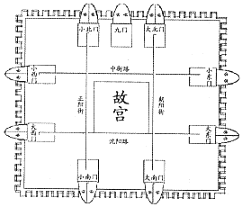 下面是沈阳故宫的一幅简易示意图,请简要概括其布局结构特点。