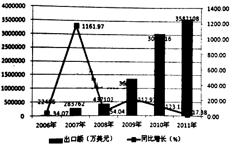 B.2006~2011年间,中国光伏产品出口同比增长率最高的年份是2007年,以后几年产值虽逐年增加,但同比增长的比率逐年下降。