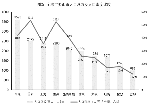 C.人口密度与人口总数并不一定成正比。东京的人口密度要比首尔低得多,但人口总数却远高于首尔,意味着其人口增长的空间比较小。