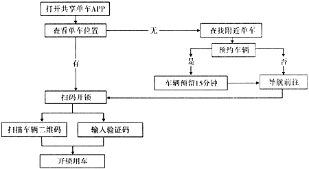 下面是某市共享单车使用流程图,请把这幅流程图转写成一段话,