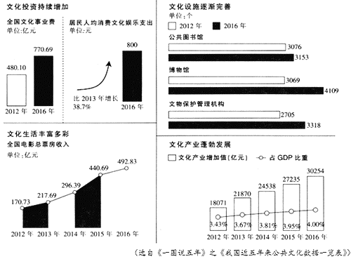 C.材料二“文化设施逐渐完善”图表明,2012年时,公共图书馆的数量比文物保护机构多,但是2016年的情况相反。