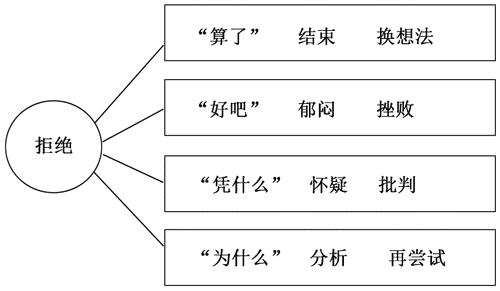 某同学拟了一个被拒绝后常见的四种反应及应对方式的构思框架,