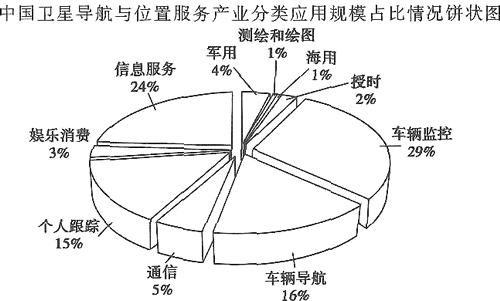 A.在中国卫星导航与位置服务产业分类应用中,位次排列在前三名的产业是车辆监控、信息服务与车辆导航,占据着总份额的69%。