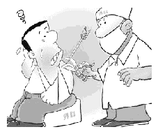 内容:漫画画了两个人:伤者左臂中箭,箭杆露在外边;医生手拿剪刀,正要把箭杆剪断。寓意:解决问题只顾表面,不清除根源。